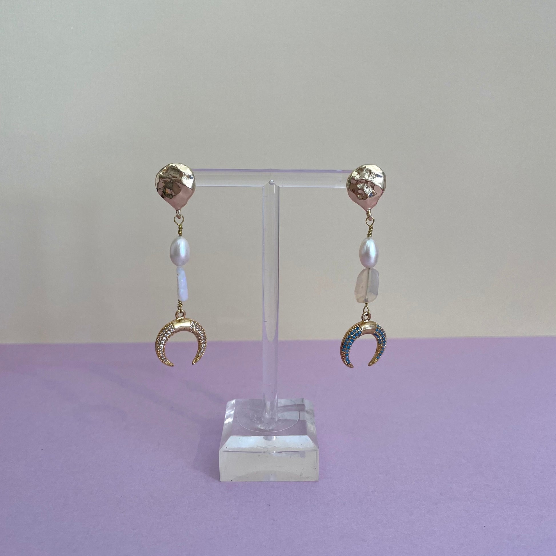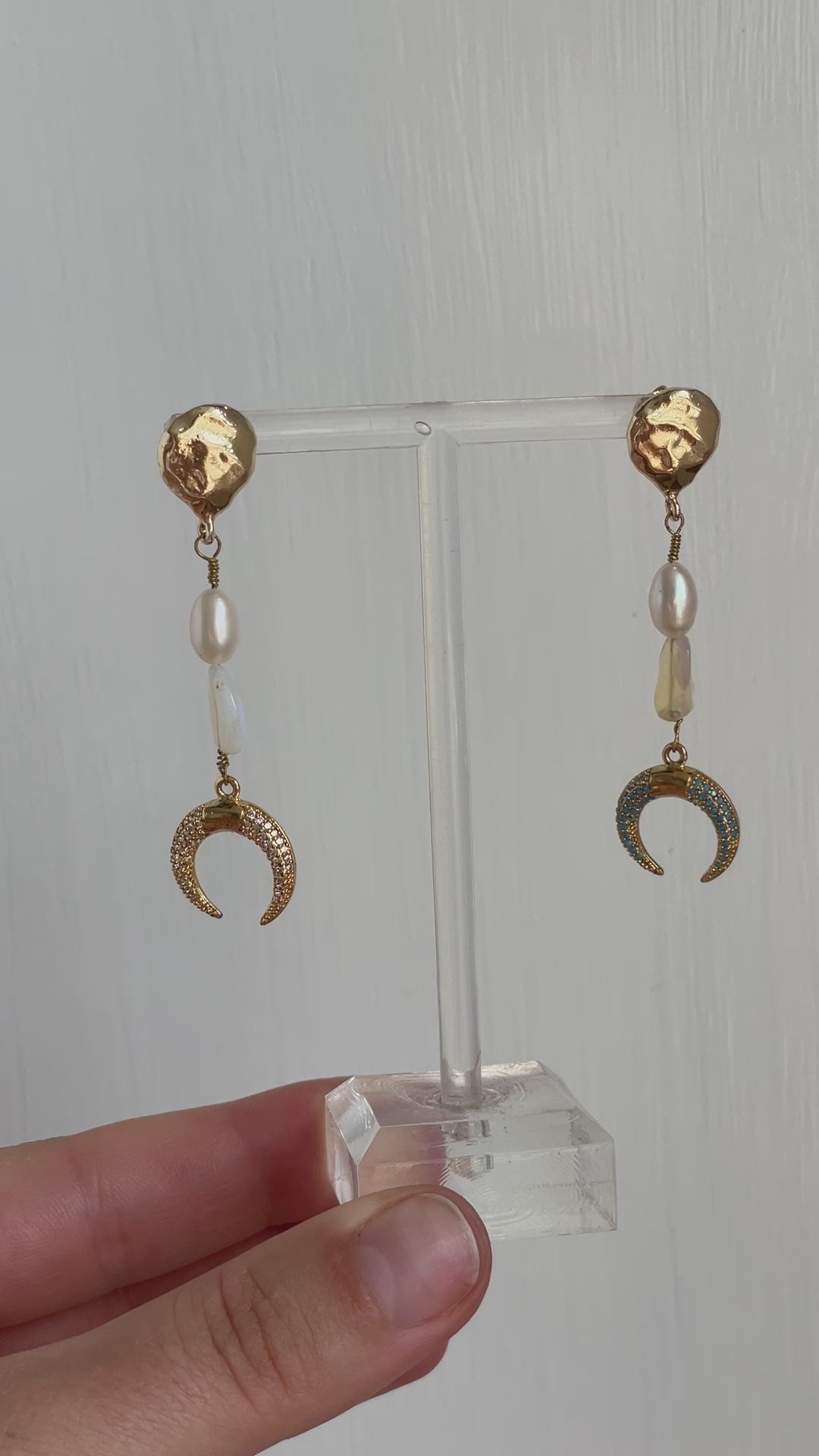 Our opals are paired like sisters from another mister (different shapes, similar weight) making them extremely alluring when the light catches their fire. This paired with gold nugget earring posts and beautiful freshwater pearls makes this a pearlfect combination.