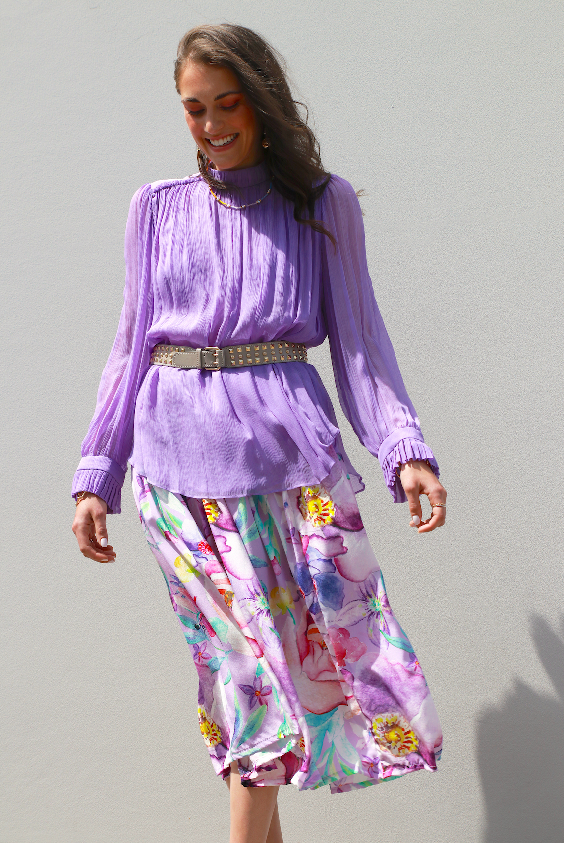 Featuring an exquisite floral pattern and handcrafted from 100% silk, this signature midi skirt is a sure fire showstopper.