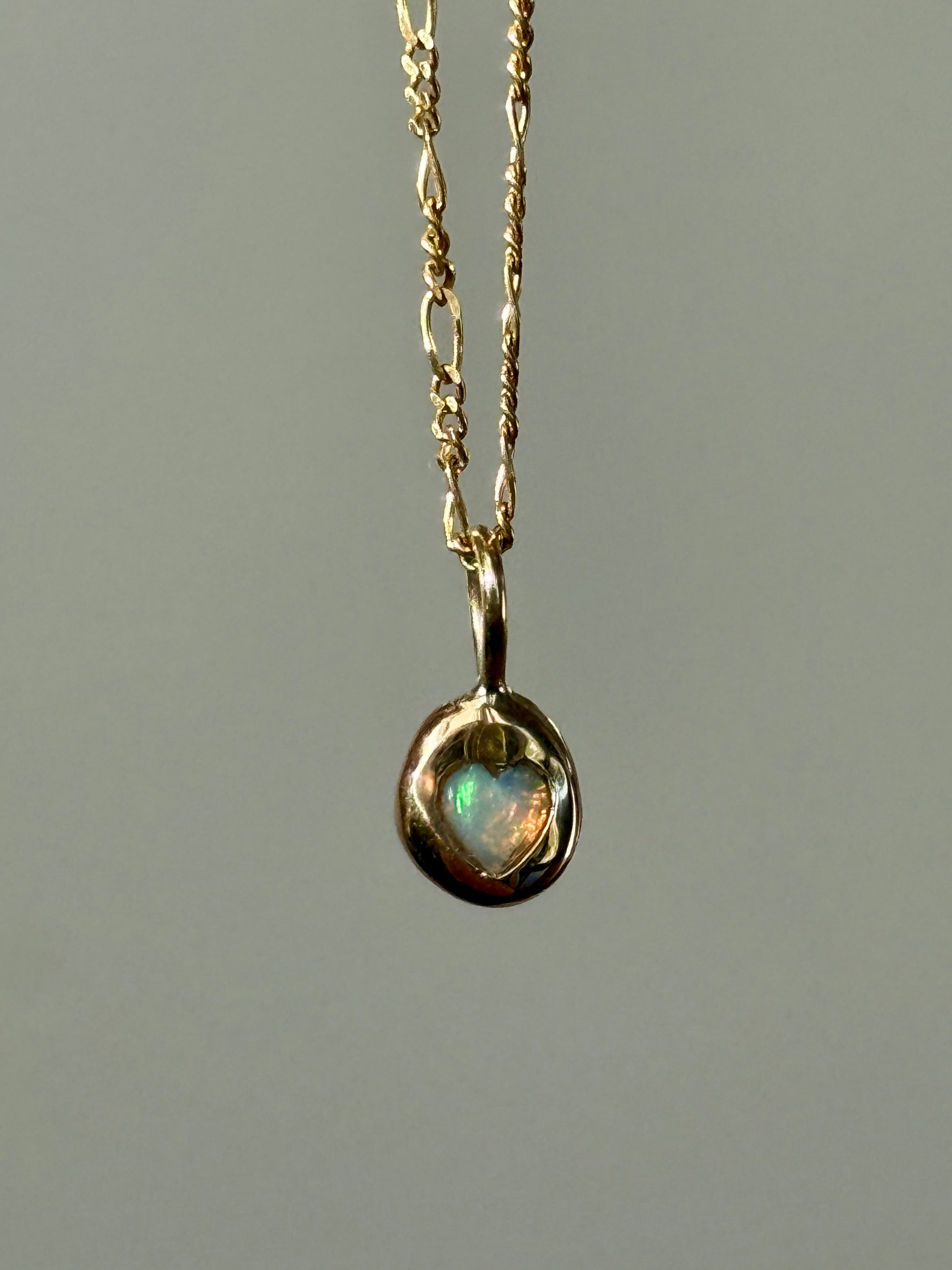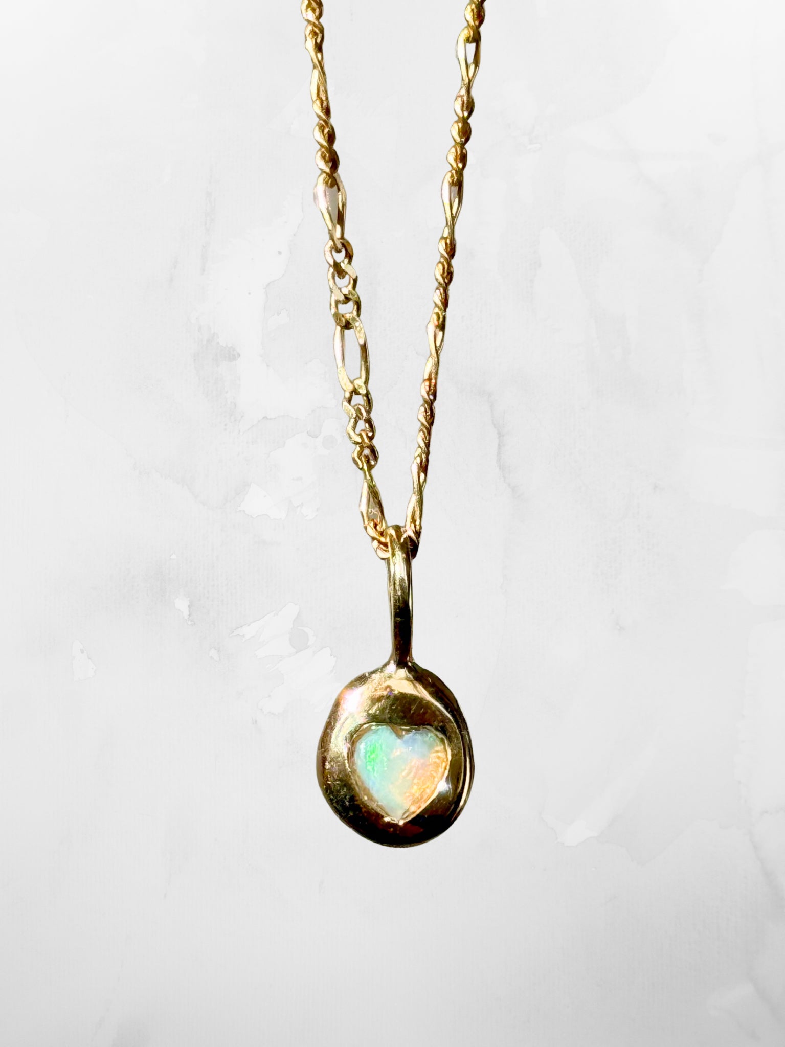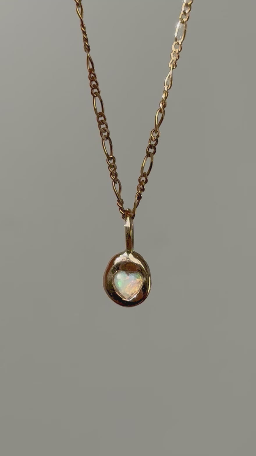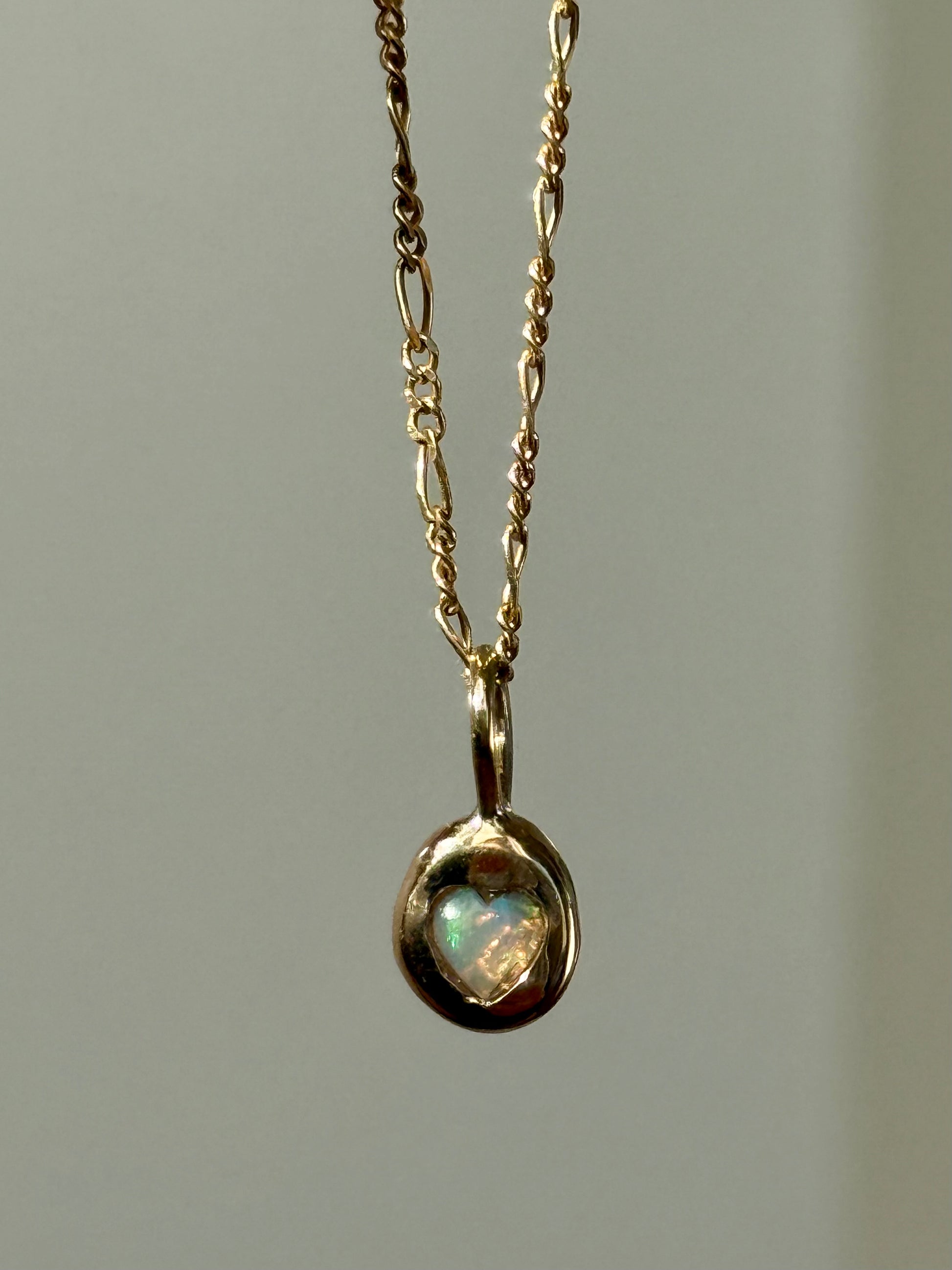 The Iridescent Pendant features a stunning heart-shaped natural opal that radiates a captivating rainbow of colors. Handmade with care, this unique gemstone piece adds a touch of vibrant elegance and heartfelt charm to any outfit, making it a perfect statement accessory.