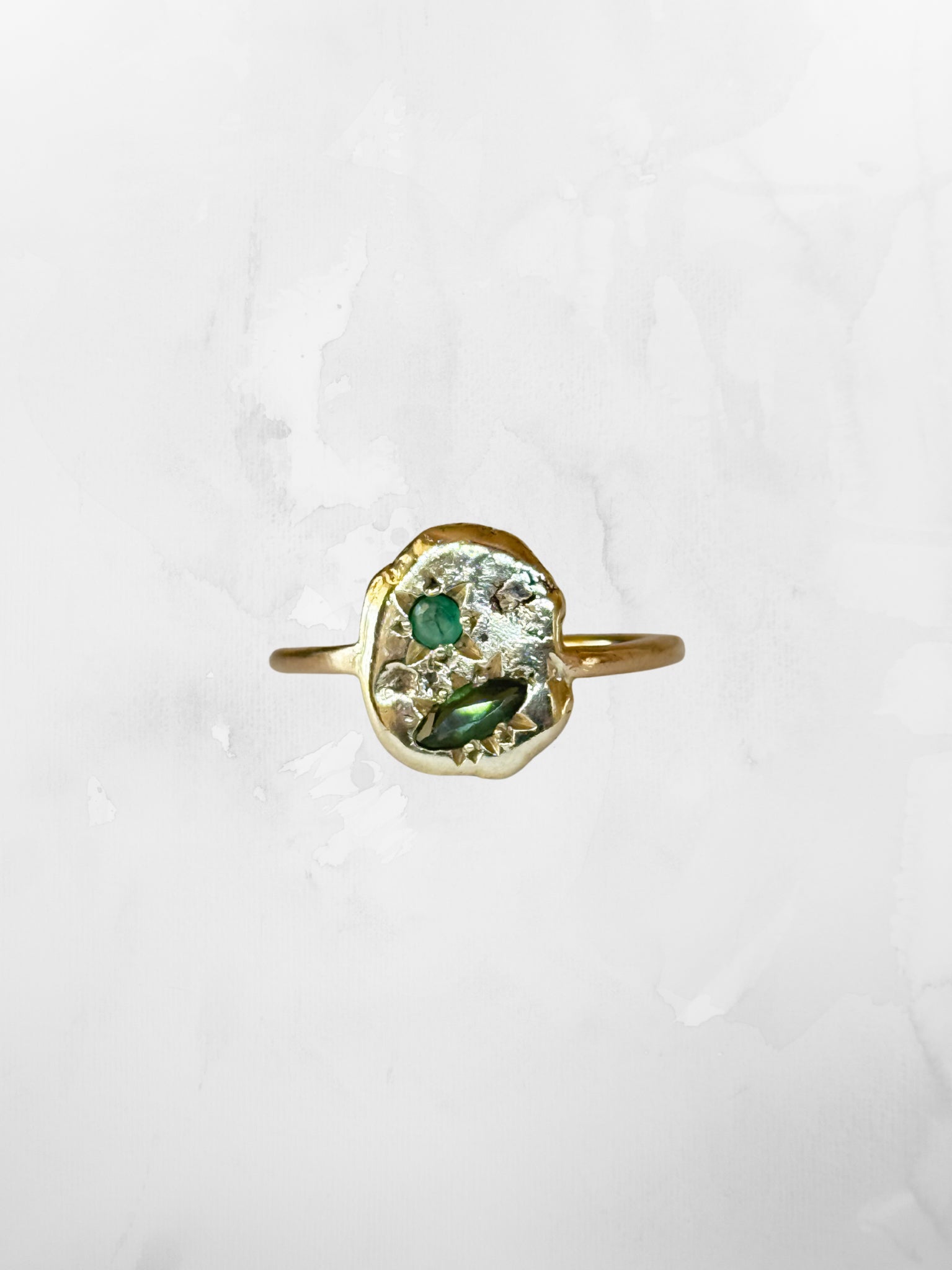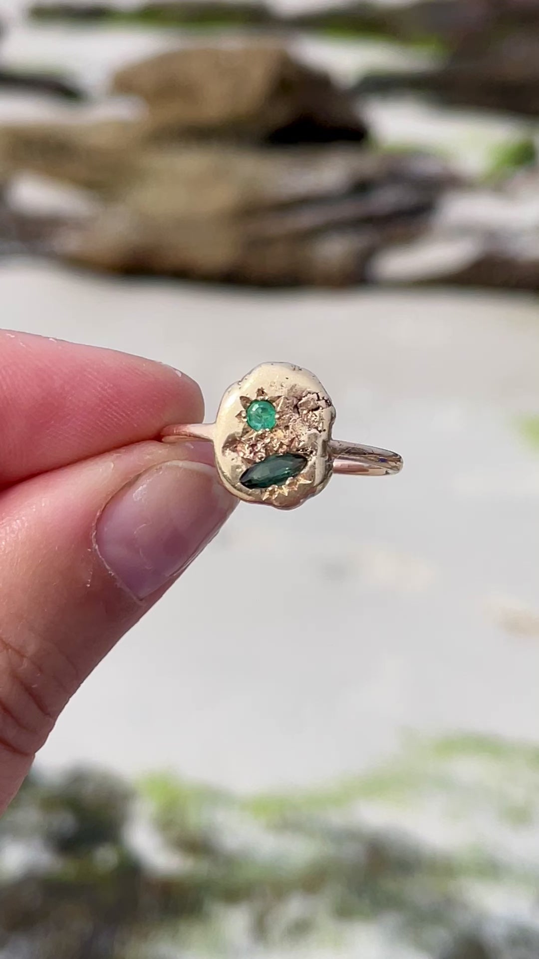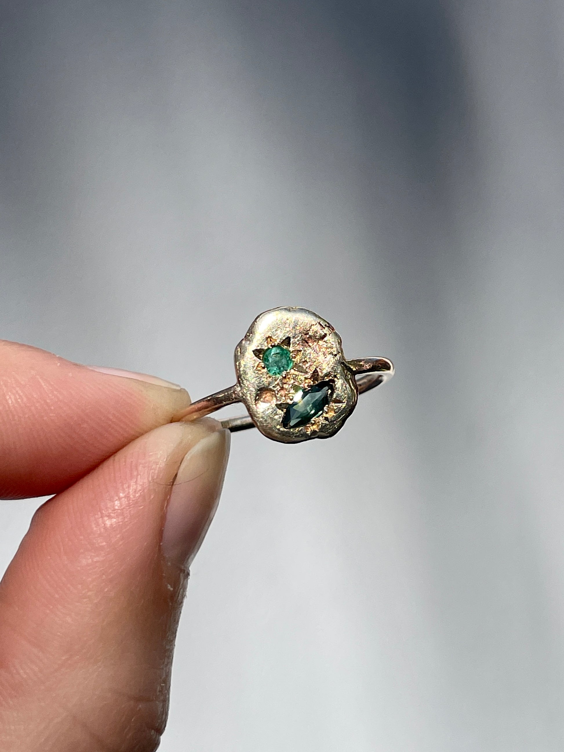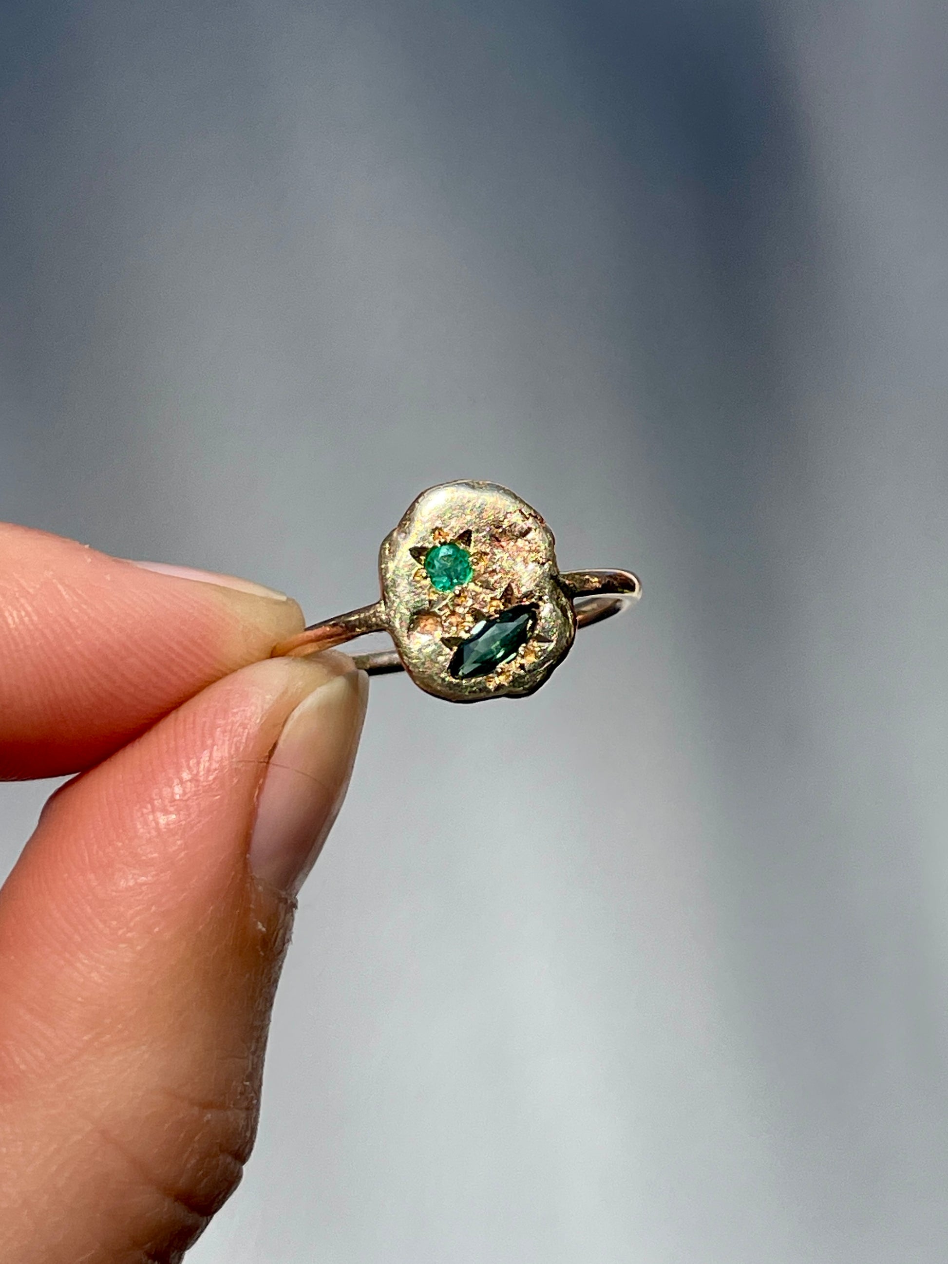 Perfect for adding a touch of organic elegance to any look, this captivating ring features a gorgeous green marquise sapphire and round emerald stone - so blissful, you'll have ring envy in no time!