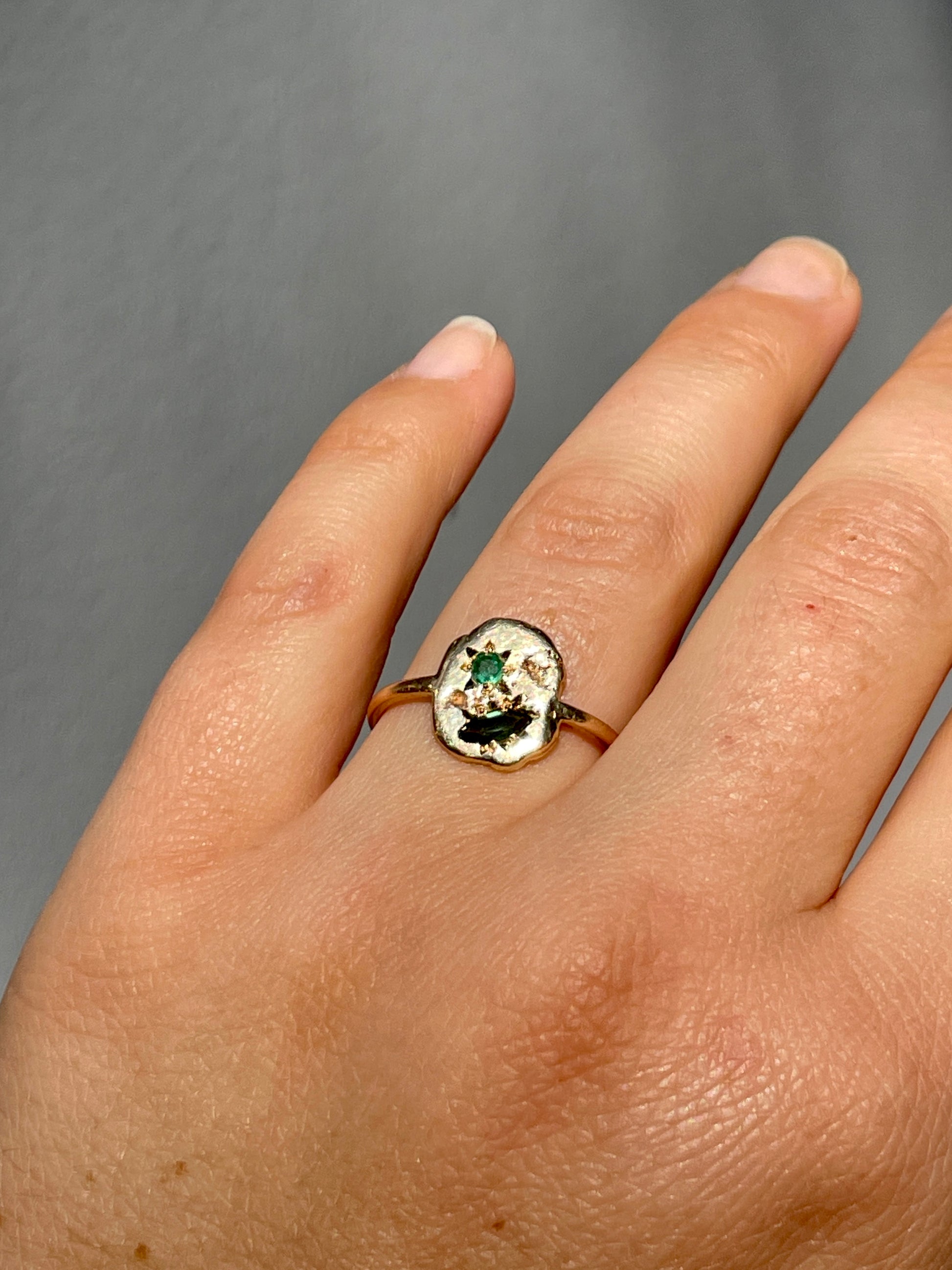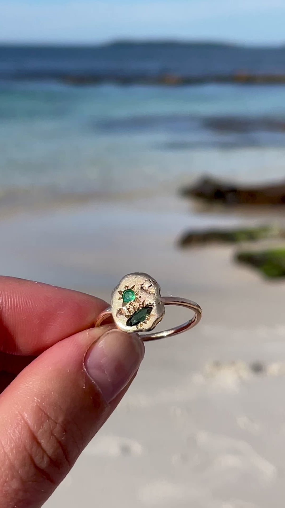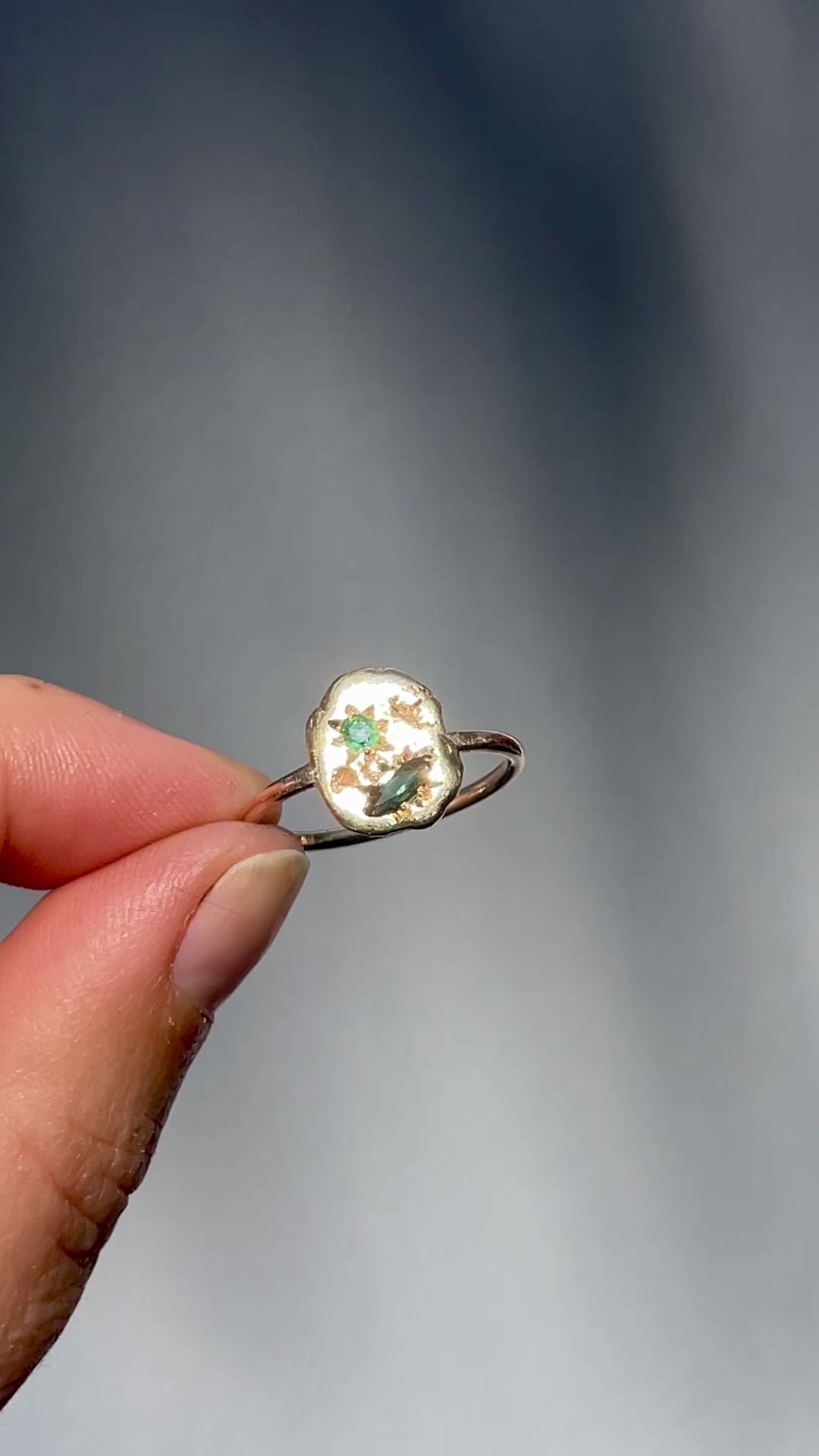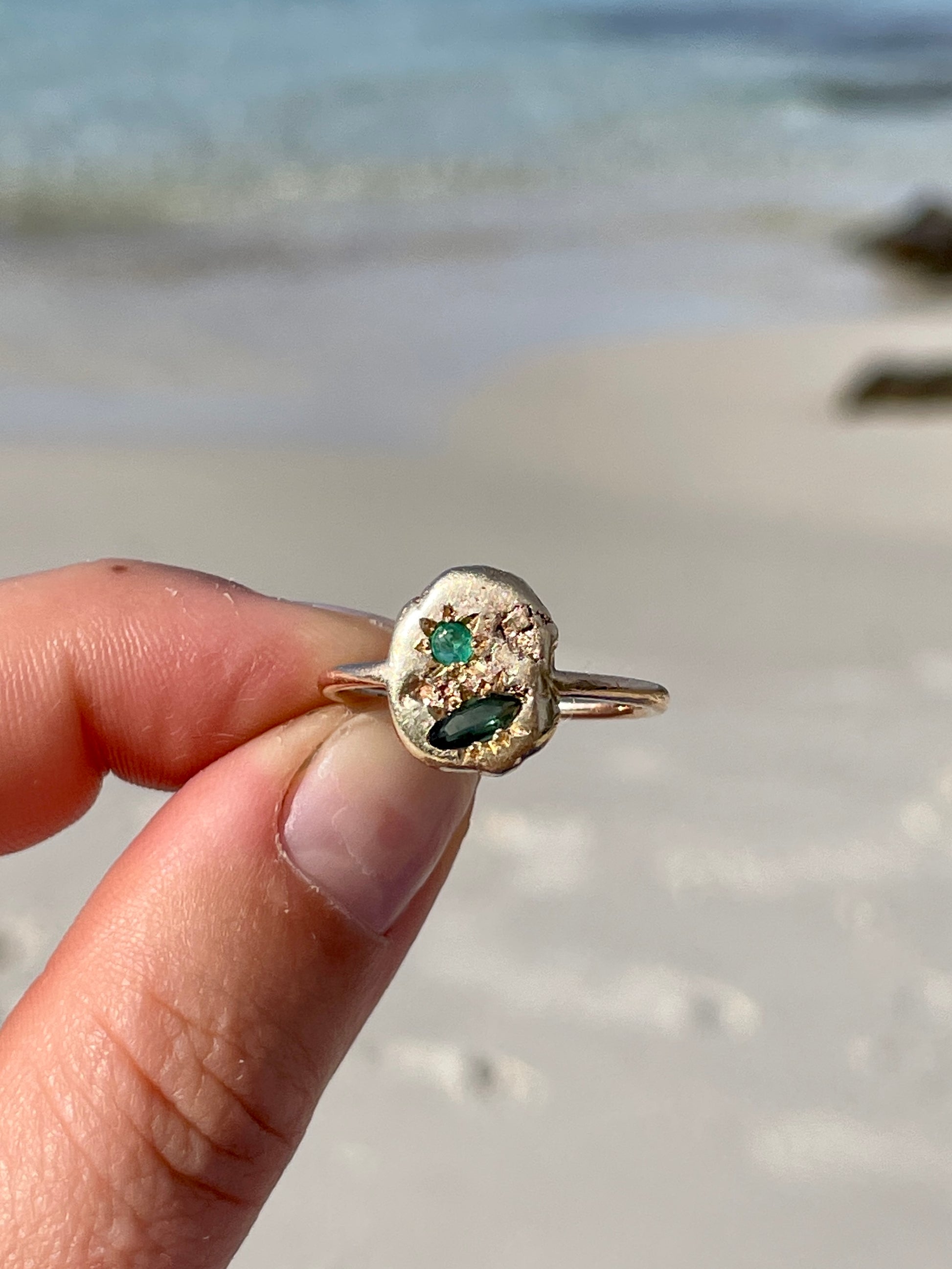 Perfect for adding a touch of organic elegance to any look, this captivating ring features a gorgeous green marquise sapphire and round emerald stone - so blissful, you'll have ring envy in no time!