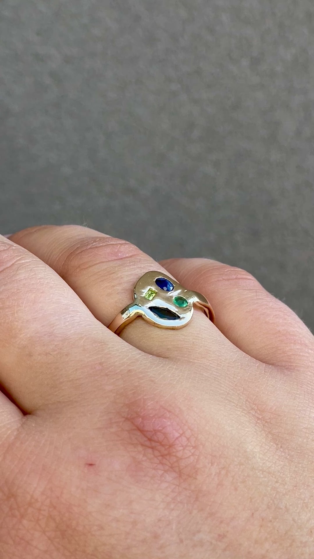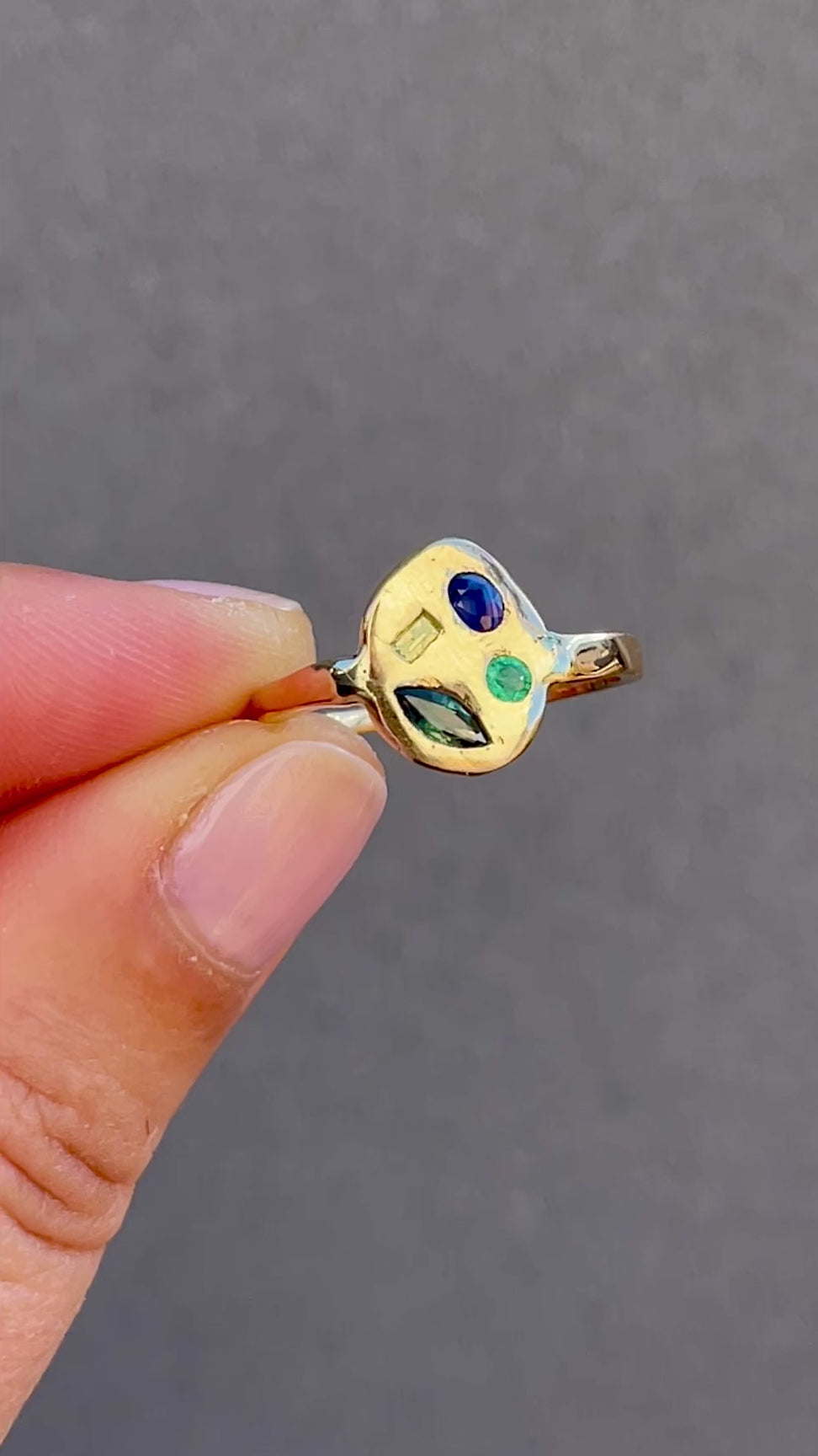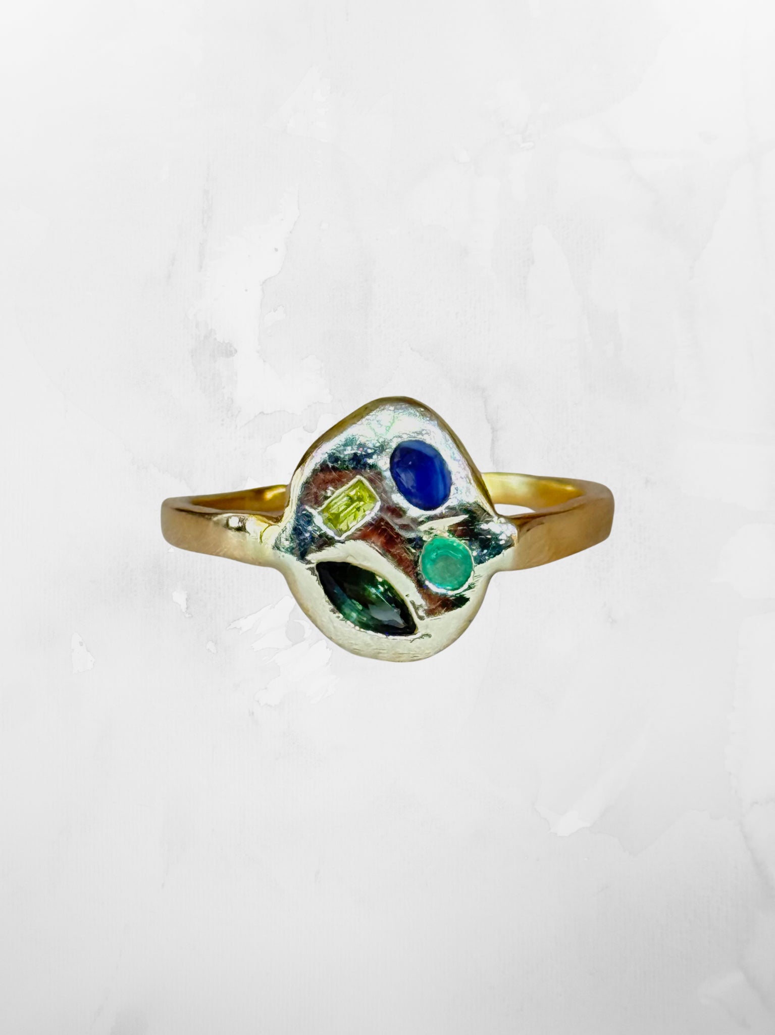 Stones: moody green marquaise sapphire | round apple green emerald | oval cobalt sapphire | yellow baguette diamond