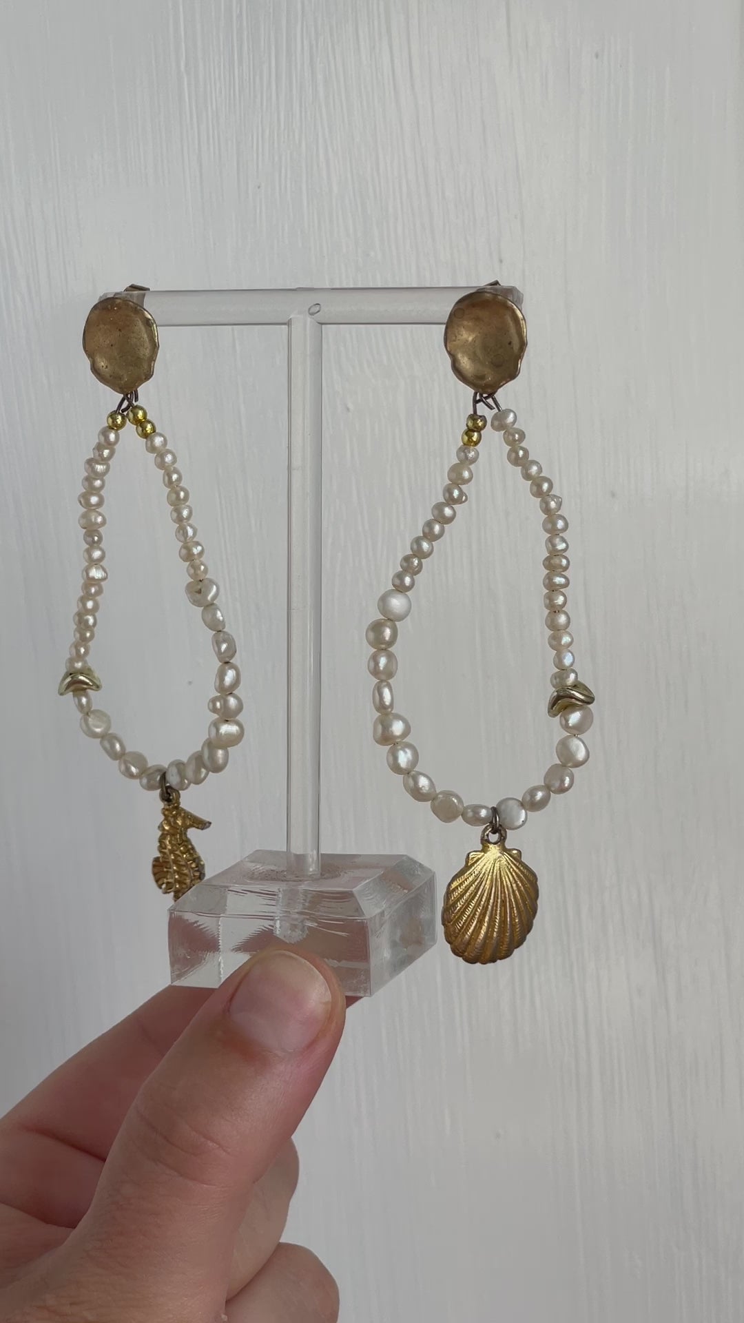 Freshwater pearls paired with gold seahorse, shell and accents.