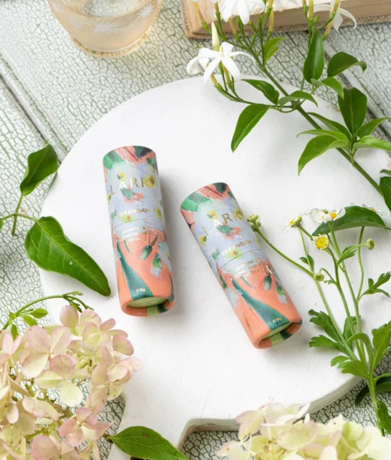 Sambac and grandiflorum jasmine, Roman chamomile, honeysuckle, pink grapefruit, sandalwood, boronia.