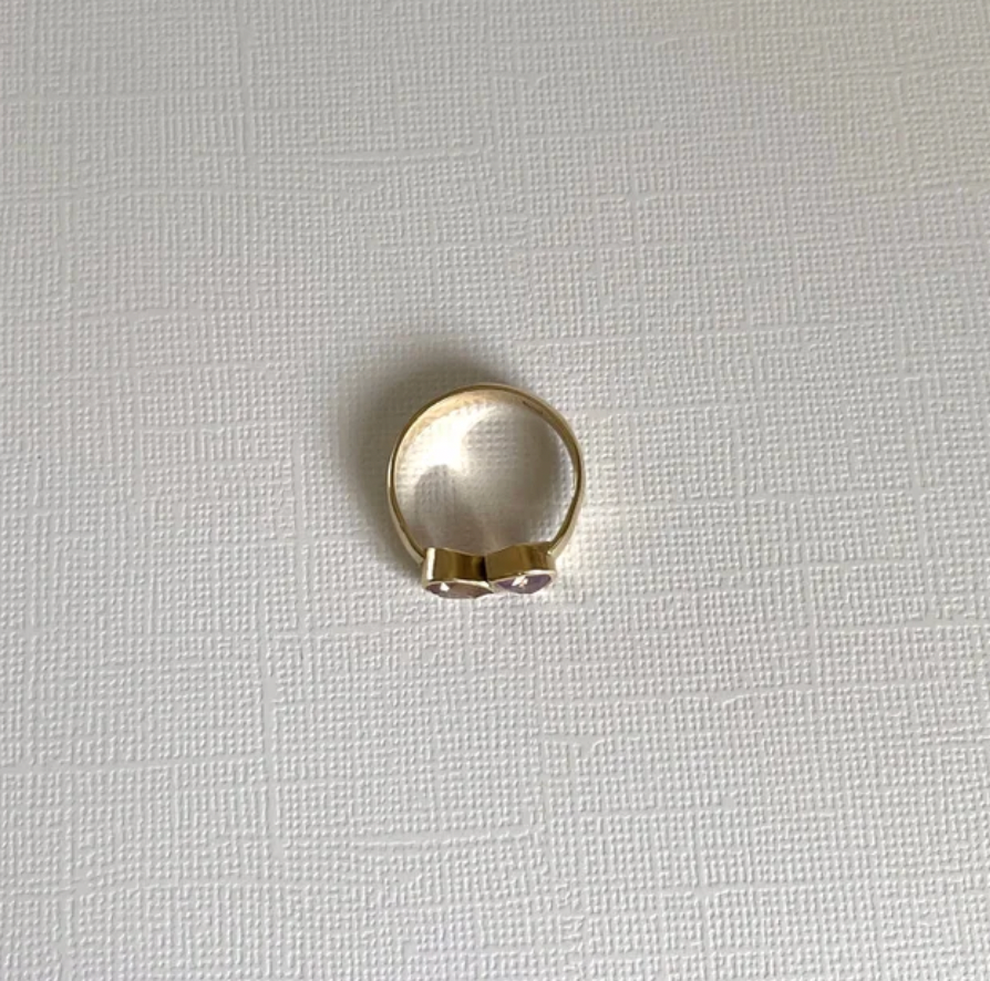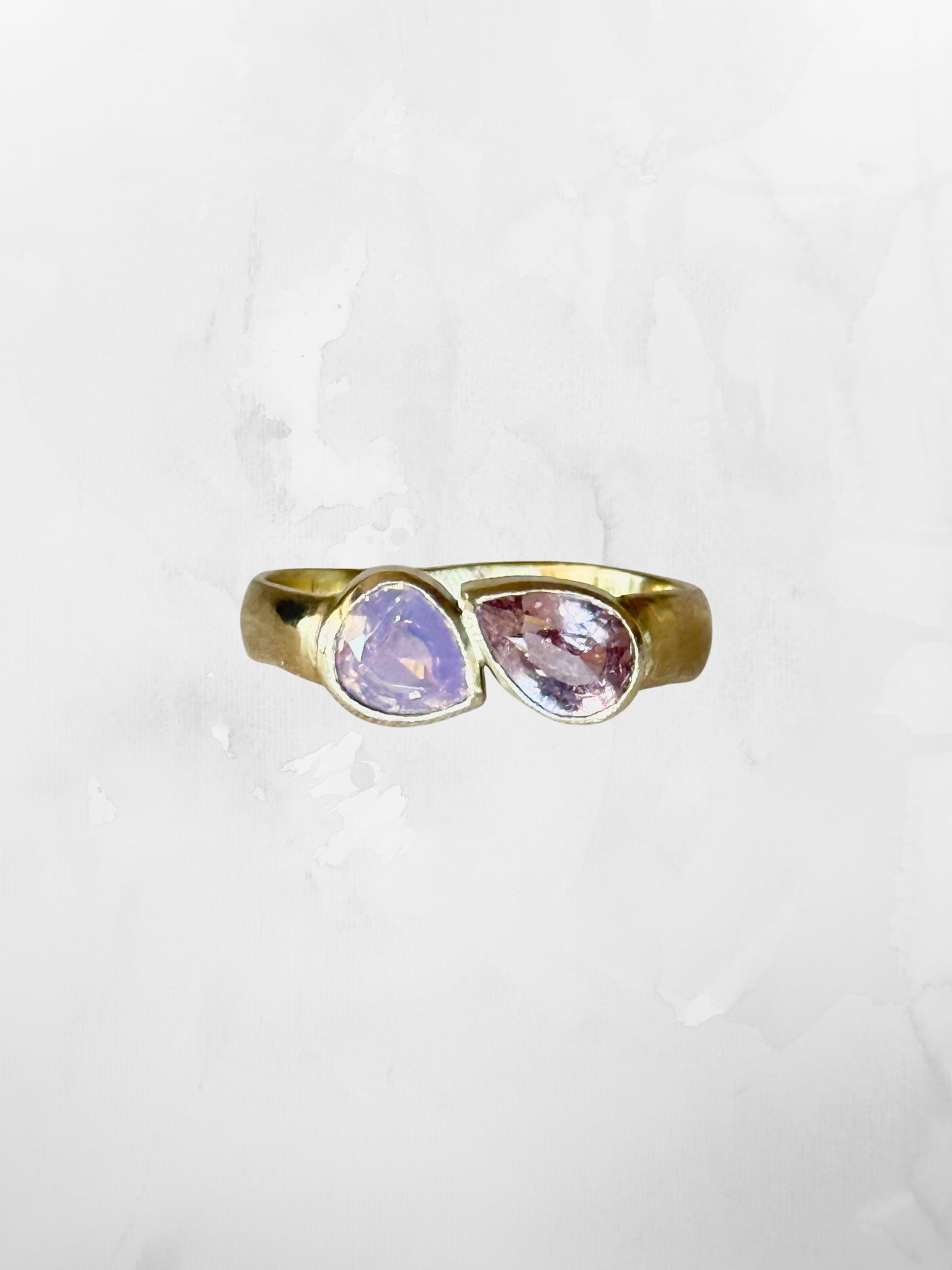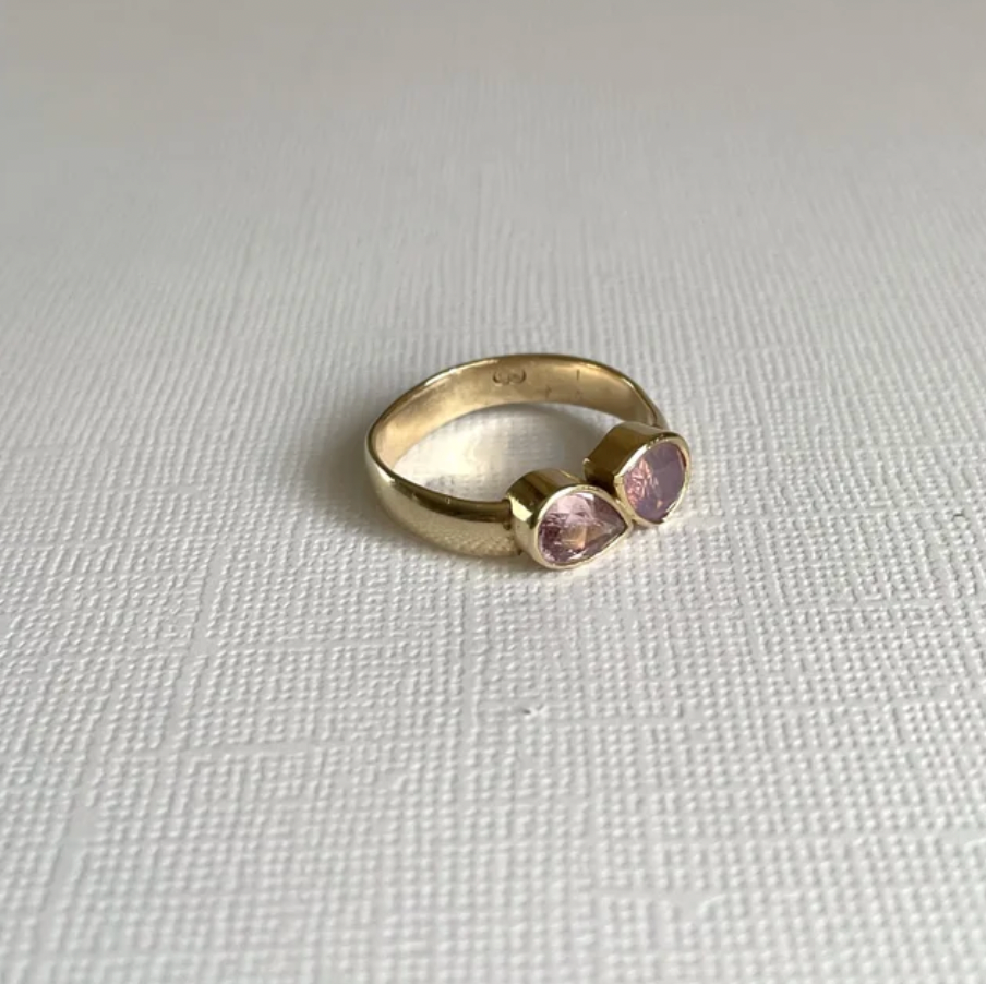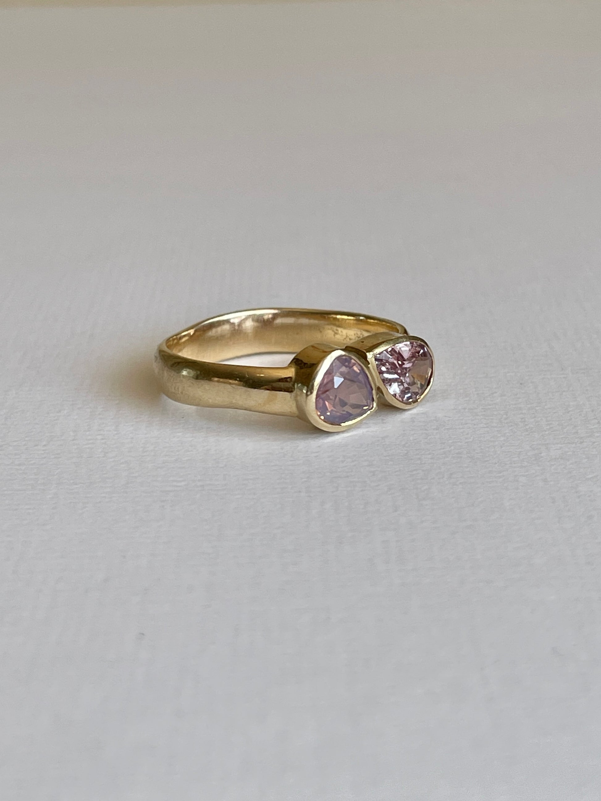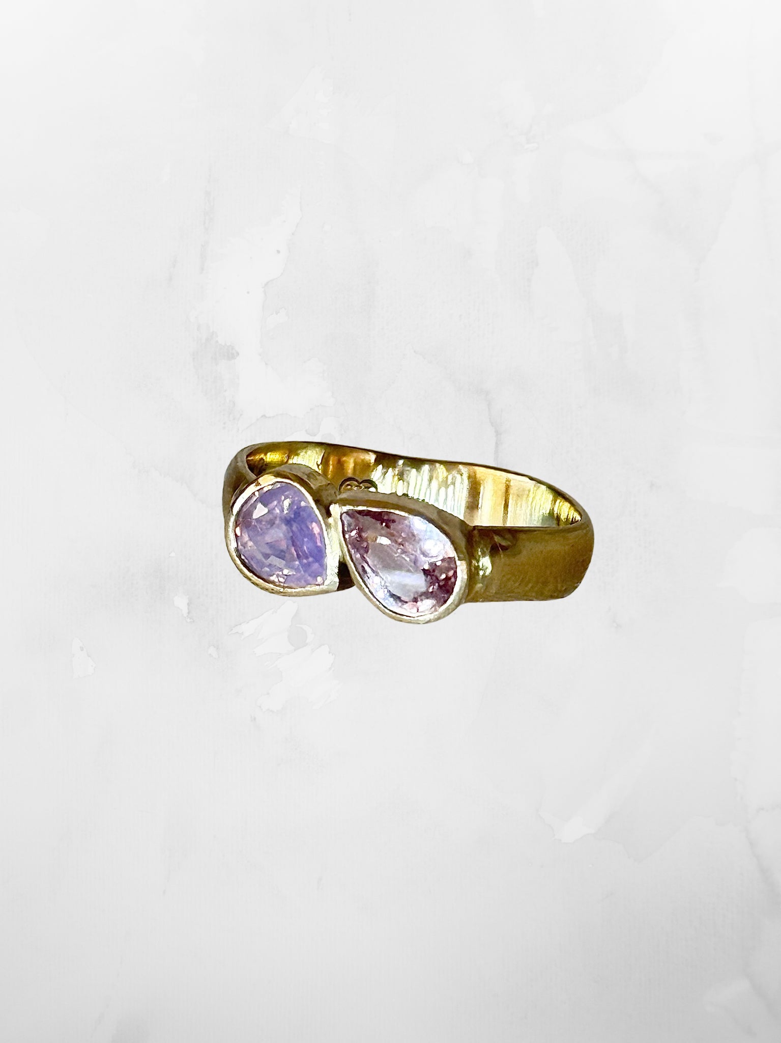 Unique, handmade double pear sapphire ring set in a smooth/slightly uneven 9ct solid gold band.